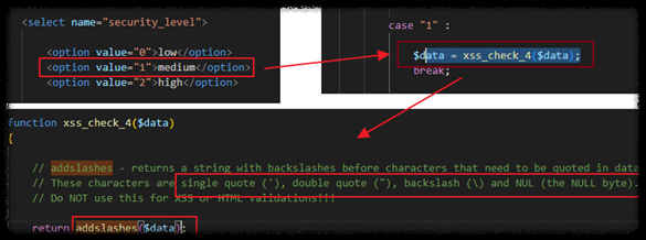 Step 1) 난이도 중간으로 설정 후 스크립트 구문인 ‘<script>alert(’xss test’)</script> 입력 시, 스크립트 동작하지 않는 것으로 확인하여 입력한 스크립트 구문이 어떻게 필터링 되고 있는지 확인하기 위해 해당 소스코드 페이지인 ‘xss_stored_1.php’ 확인 시, ‘xss_check_4’ 함수가 동작하고 있으며, addslashes라는 함수로 싱글쿼터(‘), 더블쿼터(“), 백슬래쉬(\), null 문자를 이스케이프 처리하여 실행이 되지 않도록 방어하고 있는 것을 확인