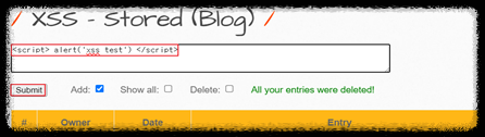 Step 1) XSS–Stored(Blog)으로 이동 후, 해당 입력란에 XSS 취약점이 있는지 확인하기 위해 스크립트 구문인 ‘<script>alert(’xss test’)</script>'입력 시, 스크립트 정상 동작 확인 및 웹서버에 저장되는 Stored 방식이므로 해당 게시물에 접근할 때마다 스크립트가 실행되는 것을 확인