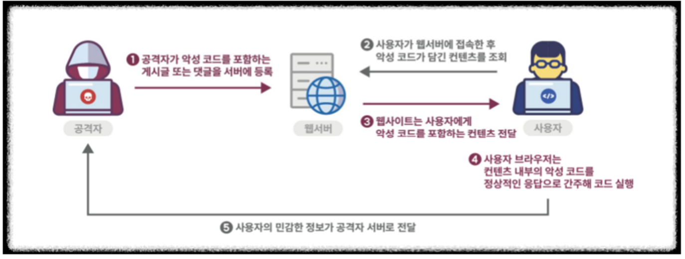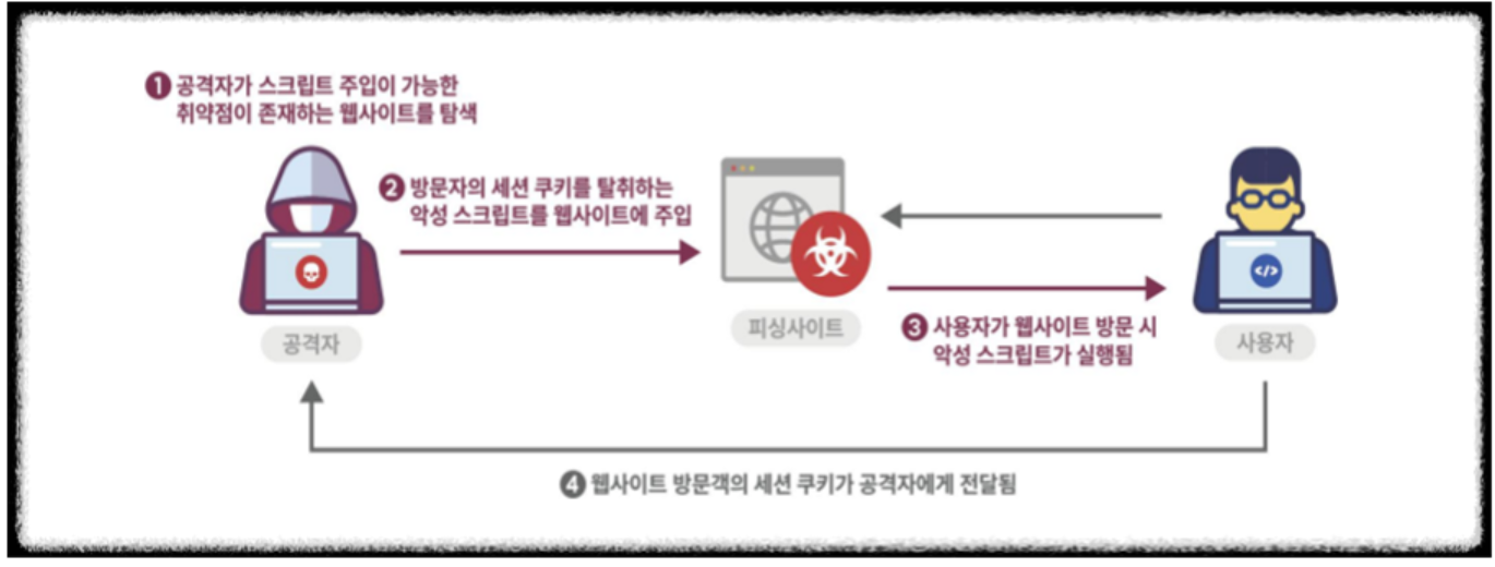 - 사용자 요청에 의해 검증되지 않은 외부 입력 데이터(부적절한 스크립트)가 포함된 동적 웹페이지가 생성·전송되는 경우, 사용자가 해당 동적 웹페이지를 열람함으로써 웹 페이지에 포함된 부적절한 스크립트가 실행되는 공격