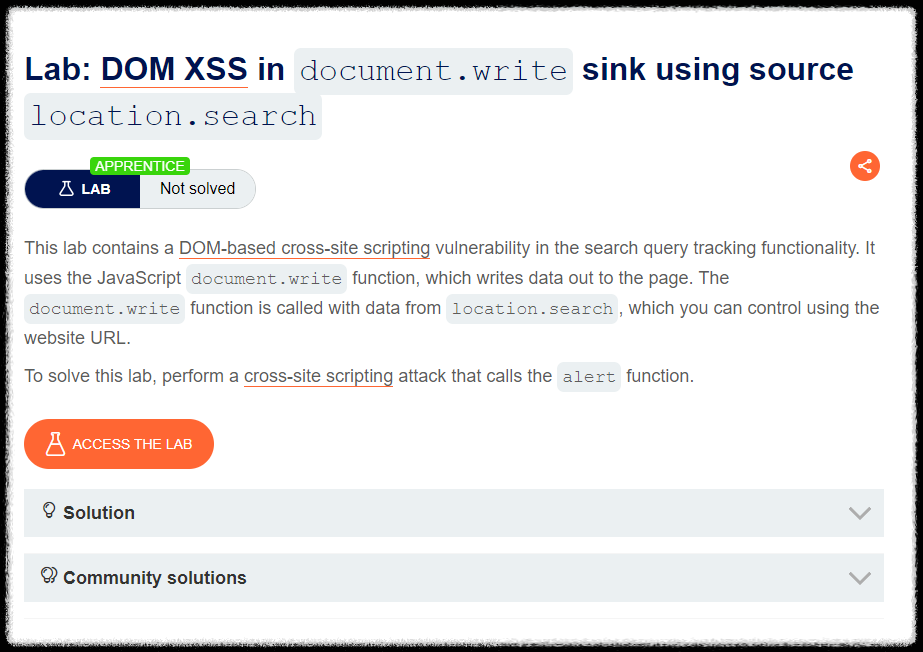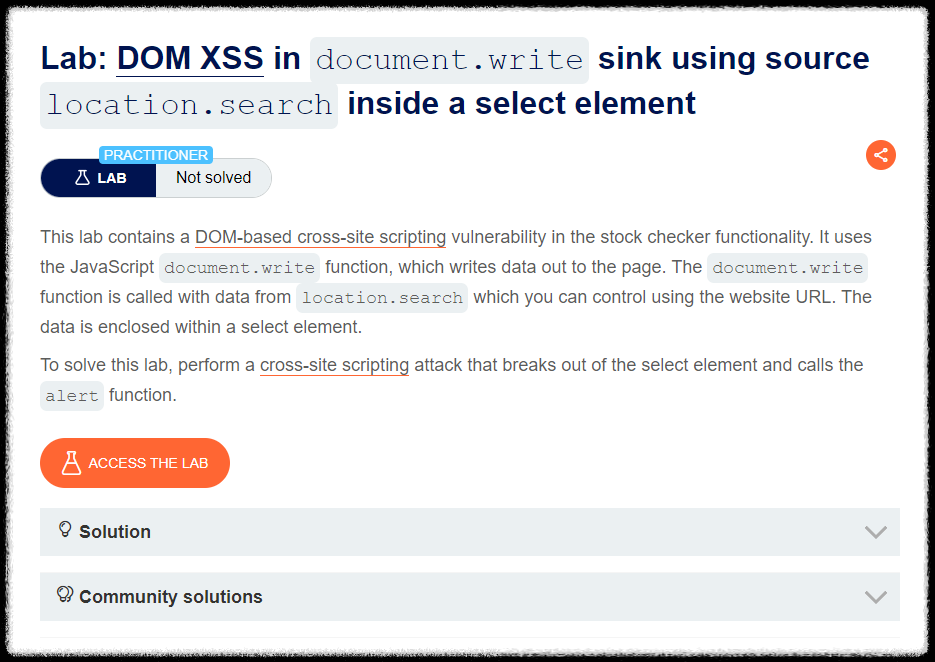Step 1) PortSwigger Web Academy에 XSS Lab 접근. 해당 LAB은 Javascript의 document.write 함수를 사용하고 있는 것으로 확인. Javascript에 XSS 공격을 수행하여 alert 함수를 사용하는 것이 목표.