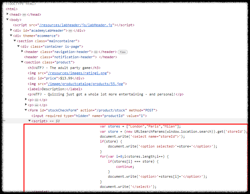 Step 2) 페이지 내 제고 체크하는 버튼 클릭 시, 파라미터 중 하나인 'productId'를 document.write함수를 통해 출력하는 것을 확인할 수 있었으며, 요청값에는 'productId'를 보내지 않는 것으로 확인했을 때 고정으로 설정된 'London', 'Paris', 'Milan'을 체크하면 'productId'가 스크립트를 통해 동작하는 것으로 확인.